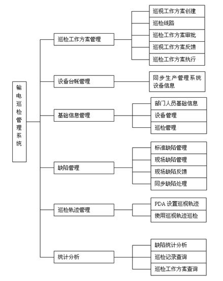 系統(tǒng)功能主要包括:輸電工作方案管理、輸電巡視卡管理、缺陷管理、巡視設(shè)置管理、查詢統(tǒng)計(jì)、PDA現(xiàn)場(chǎng)巡視管理、系統(tǒng)管理、同步對(duì)接數(shù)據(jù)管理,如下圖所示: